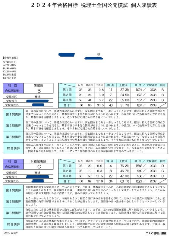 全国模試の成績表です。簿記論では、各大問でBという判定になりました。確実に拾える箇所での得点ができていなかったです。財表も、理論で金融基準を覚えきれず、拾えるところも拾えず、とんでもない点数になってますね💦