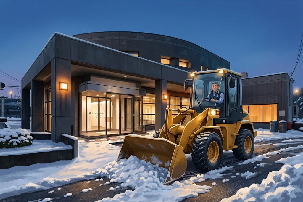 今回、私に与えられた新たな役割は「大型特殊免許」の取得。 黒野さんも仰る通り、ここ大野市の冬は過酷です。朝、事務所の駐車場が雪で埋まっていれば、スタッフは仕事前に力尽き、お客様は足を踏み入れることすらできません。